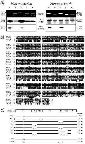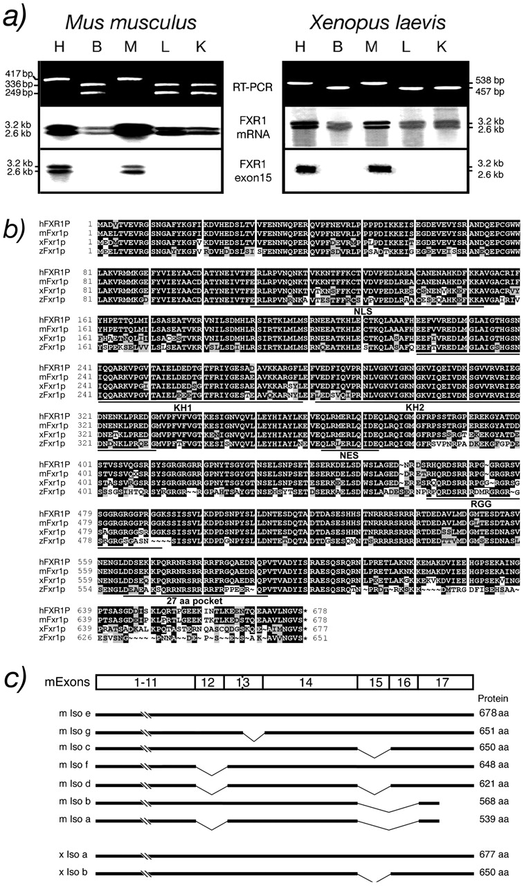 Figure 2 Fxr1p is conserved in vertebrates. (a) Detection of xFxr1 mRNA variants by RT-PCR in different tissues from mouse and frog by using primers flanking the muscle-specific exon. Northern blots containing RNA isolated from murine and frog tissues (H, heart; B, brain; M, muscle; L, liver; and K, kidney) were hybridized with probes specific for mouse and frog Fxr1. The muscle sequence (exon 15) is found in both mouse and Xenopus. (b) Amino acid sequence of Xenopus Fxr1p (xFxr1p) aligned with human (hFXR1P), mouse (mFxr1p), and zebrafish (zFxr1p) sequences. Conserved amino acids are boxed in black, similar amino acids are in light gray and divergent amino acids are in white. (c) Representation of the mouse (m Iso a-g) and Xenopus (x Iso a and b) Fxr1 mRNA-spliced variants.