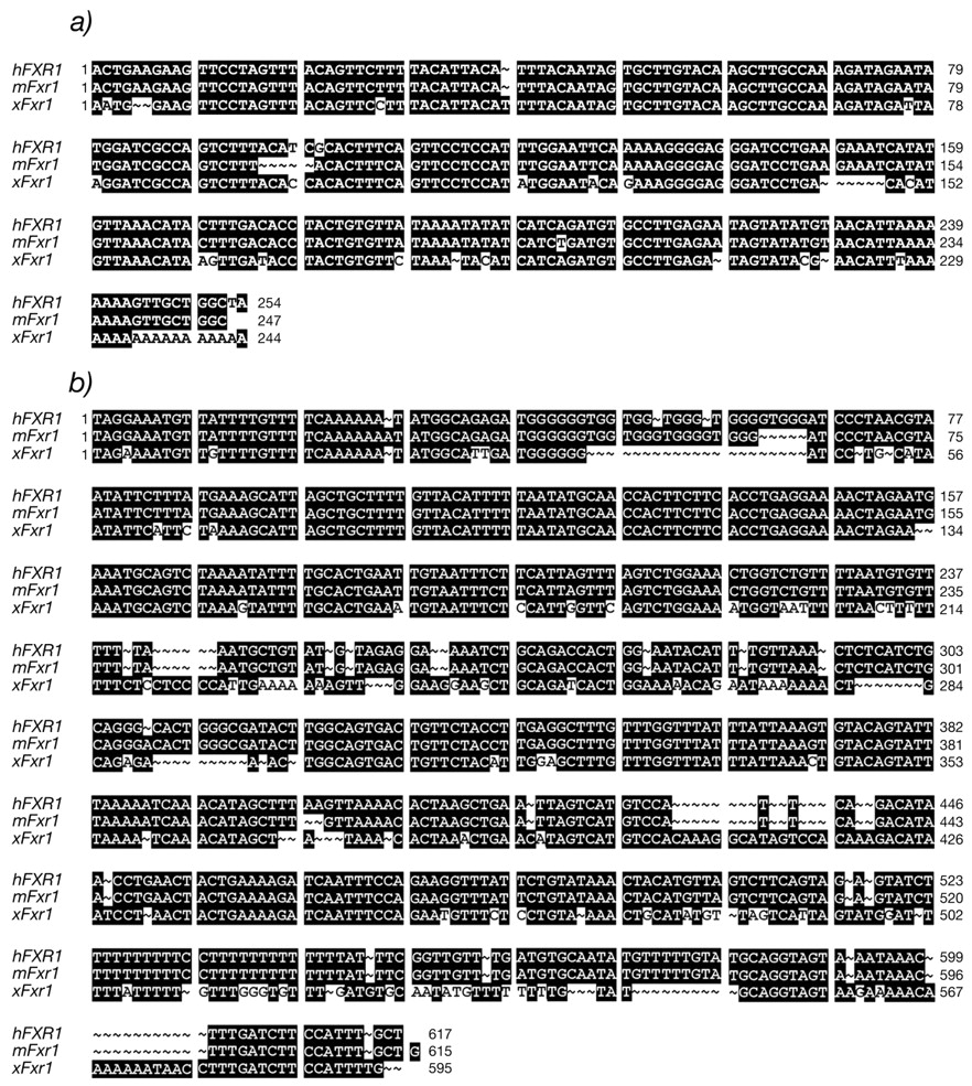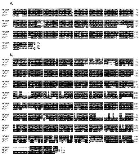 Figure 3. Nucleotide alignment of human, mouse, and frog 3′-UTR. (a) Short 3′-UTR. (b) Long 3′-UTR. Nucleotides are numbered according to Kirkpatrick et al. (1999) and GenBank accession no. U25165.