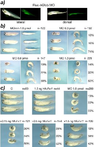 Figure 5. Morphological alterations induced in Xenopus embryos after injection of Fxr1.Morpholino (Fxr1.MO). (a) Lateral and dorsal views of control embryos for the diffusion of the fluorescein tagged Morpholino directed against the human globin (hGlob.MO) injected in one blastomere of two-cell stage embryos. (b) Injected embryos with xFxr1.MO mismatch (mm) as control, and with increasing concentrations of match MO. Number of injected embryos (n =) is on the right of each panel, as well as percentage of penetrance of the depicted phenotypes. The severity of morphological alterations is proportional to the concentration of injected Fxr1.MO (0.3-1.0 pmol). (c) Rescue of the phenotypes is dose-dependent of the injected HA.Fxr1 mRNA.