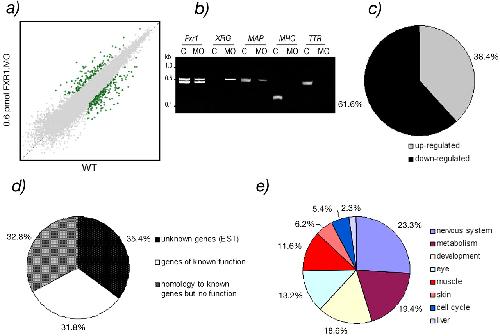Microarray analyses of injected embryos with 0.6 pmol of xFxr1.MO versus wild-type embryos. (a) The data set in the squatter plot shows the expression levels of genes on a logarithmic scale as the median value of uninjected (x-axis) and xFxr1.MO injected (y-axis) embryos. The threshold for significancy (p < 0.05) was set at 2.5-fold of change. (b) Examples of validation of RT-PCR analyses of stable (Fxr1), increased (XIRG), and decreased (MAP2, TTR, and MHC) mRNAs in knockdown experiments. (c) Percentage of up- and down-regulated transcripts. (d) Percentage of transcripts of unknown (EST) or known functions, and those presenting homologies to genes not yet described in Xenopus. (e) Tissue distribution of the 129 known transcripts (31.8% in Figure 8d) affected. Note that due to overlapping of these transcripts in different tissues the distribution is only relative and cannot be considered as absolute.