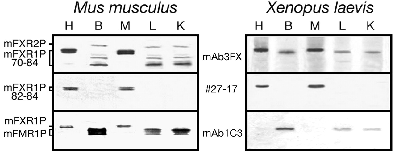 Expression of Fxr1p in mouse and frog. Immunoblot analyses of Fxr1p in selected tissues of adult mouse (left) and adult Xenopus (right). Antibody mAb3FX is directed against an epitope common to all Fxr1p isoforms from both mouse and frog, whereas #27-17 is directed against the 27-amino acid pocket coded by the exon 15 that also is present in Xenopus. Fmr1p is detected predominantly in brain extracts from both mouse and frog. Note the cross-reactivity between mAb1C3 and Fxr1p in mouse heart and muscle as described previously (Khandjian et al., 1998; Chemicon International information sheet, MAB2160). H, heart; B, brain; M, muscle; L, liver; and K, kidney.