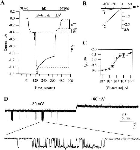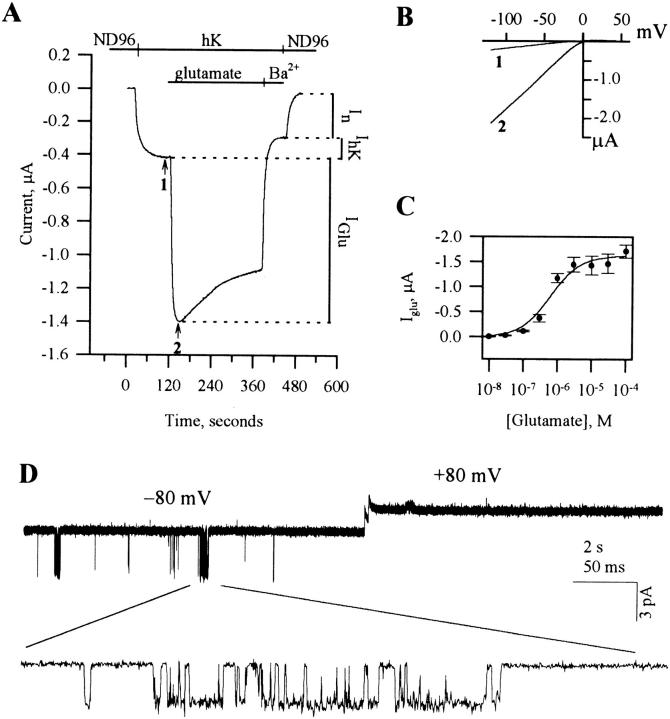 Figure 1. GIRK activation by mGluR2. (A) Two-electrode voltage-clamp recording from a cell expressing mGluR2 and GIRK1. Bars above trace show solutions applied. (B) Current-voltage relationships of the GIRK currents at the times indicated by arrows in A: in hK alone (1) and in glutamate (2). Each net GIRK1 I-V curve was obtained by subtraction of the I-V curve recorded after addition of Ba2+. (C) Gluta-mate dose-response curve, with apparent Kd = 0.63 μM, fitted to the standard Michaelis-Menten equation. n = 3 or 4 cells for each glutamate concentration. (D) A cell-attached patch clamp record of the activity of the GIRK channel with 10 μM K-glutamate in the pipette, from an oocyte injected with RNAs of GIRK1 and mGluR2. |