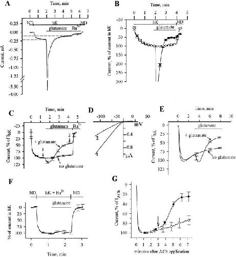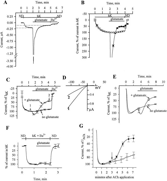 Figure 2. Inhibition of GIRK by mGluR1a. (A) Two-electrode voltage-clamp recording from a single cell injected with RNAs of GIRK1 (500 pg) and mGluR1a (25 pg). ND, stands for ND96. (B) Average recording from cells of one donor exposed to glutamate (•, n = 4) and unexposed to glutamate (○, n = 6). Ba2+ was not applied, and current was expressed as percent of the current in hK solution (IhK + In); I = 0 in ND96. (C) Inhibition of GIRK channel activity by mGluR1a in EGTA-treated oocytes: comparison of cells exposed to glutamate (n = 4) to cells unexposed to glutamate (n = 4). The cells were from the same donor, injected with 25 pg mGluR1a RNA and 500 pg GIRK1 RNA. The ND96 solution was changed to the hK solution at time t = 0. Currents in each oocyte were normalized to the peak basal GIRK current, IhK. Average traces from all 4 oocytes are shown. The mean IhK was 313 ± 29 nA (n = 8) in these oocytes. (D) Current-voltage relationships of GIRK currents at the times indicated by arrows in C, in a cell injected with EGTA: in hK (1) and in glutamate after the decay of the current (2). Net GIRK I-V curves were obtained as in Fig. 1 B. (E) Inhibition of GIRK1/GIRK2 channel activity by mGluR1a in EGTA-treated oocytes. Presentation as in C; n = 4 oocytes for each treatment. In this batch, oocytes were injected with 50 pg mGluR1a RNA and 250 pg of each of the GIRK1 and GIRK2 RNAs. Average IhK was 4,126 ± 707 nA (n = 8). (F) Absence of glutamate-activated inward current in oocytes incubated in 300 μM BaCl2. Oocytes were injected with RNAs of mGluR1a (25 pg) and GIRK1 (500 pg) and treated with EGTA. Ba2+ (300 μM) was added to all solutions. Currents in each cell were normalized to the peak inward current observed in the hK solution, which, because of the block of GIRK, equals to In (the average current in the hK solution was 86 ± 8 nA, n = 5). (G) Inhibition of m2R-induced activation of GIRK by mGluR1a. Oocytes expressing mGluR1a, m2R, and GIRK1, and injected with EGTA before recording, were placed in hK solution and then exposed to 10 μM ACh, which activated GIRK (the record starts at the time of addition of ACh). This current is denoted IACh. 3 min after exposure to ACh (at the time indicated by the arrow), one group of cells was exposed to glutamate (•, n = 3), which caused a decrease in the current compared with cells that were not exposed to glutamate (○, n = 3). The current is expressed as percent of IACh; records averaged from all oocytes in each group are shown. |