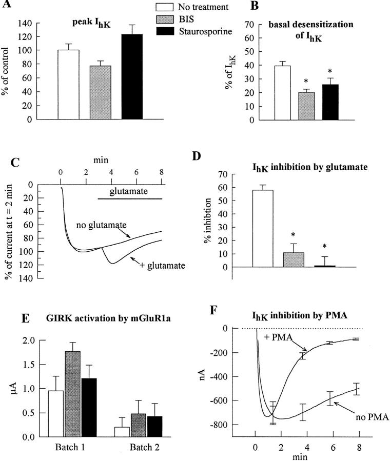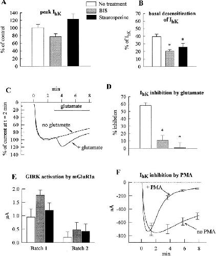 Figure 5. mGluR1a-induced inhibition of GIRK is blocked by PKC inhibitors and mimicked by PMA. Oocytes expressing mGluR1a (30 or 50 pg/âoocyte), GIRK1 and GIRK2 (250 or 500 pg/oocyte) were injected with EGTA before recording (except in F). In A, B, D and E, the treatments are presented as follows: empty bars, no treatment (vehicle only); shaded bars, BIS; black bars, staurosporine. (A) Staurosporine and BIS do not significantly alter the amplitude of IhK. Summary of two oocyte batches, n = 8 for each treatment. In each oocyte, IhK was normalized to the average IhK amplitude in untreated cells of the same oocyte batch. (B) Staurosporine and BIS attenuate the basal desensitization of IhK. Same oocytes as in A. In each oocyte, the extent of desensitization was calculated as [1 â (IhK at the end of the 8 min exposure to hK)/ (peak IhK)] Ã 100%. (C) Gluta-mate (trace denoted: + gluta-mate) fails to cause inhibition of GIRK in a representative cell treated with staurosporine; the activation of GIRK remains unimpaired. For comparison, a re-cord is shown from an oocyte (from the same donor) treated with staurosporine but not exposed to glutamate (no gluta-mate). (D) The mGluR1a-âinduced inhibition of IhK is suppressed by BIS and staurosporine: a summary of two experiments. Same oocytes batches as in A and B. The extent of IhK inhibition was calculated as explained in Fig. 3 C. (E) mGluR1a-induced GIRK activation is not significantly changed by BIS and staurosporine. (F) PMA inhibits the basal GIRK current. Oocytes were incubated in ND96 as usual and, at t = 0, exposed either to the normal hK solution (no PMA; n = 5) or to hK containing 10 nM PMA (+ PMA; n = 5). Records averaged from all oocytes in each group are shown. |