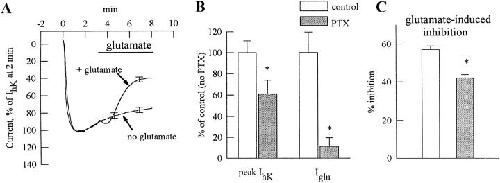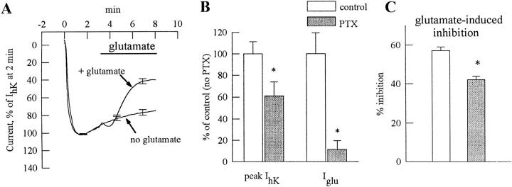 Figure 3. PTX suppresses mGluR1a-induced activation of GIRK but has little effect on mGluR1a-induced GIRK inhibition. (A) Inhibition of GIRK1/ GIRK2 channel activity by mGluR1a in EGTA-injected oocytes treated with PTX: comparison of cells exposed to glutamate (n = 4) to cells unexposed to glutamate (n = 4). The cells were injected with RNAs of mGluR1a (50 pg), GIRK1 (250 pg), and GIRK2 (250 pg). The ND96 solution was changed to the hK solution at time t = 0. Currents in each oocyte were normalized to the peak basal GIRK current, IhK. Records averaged from all oocytes in each group (n = 4) are shown. Average IhK was 833 ± 193 nA (n = 8) in these oocytes, and 1,993 ± 331 nA (n = 8) in PTX-untreated oocytes of the same donor. (B) The effect of PTX treatment on basal (IhK) and glutamate-evoked (Iglu) GIRK1/GIRK2 currents: a summary from oocytes of two donors (n = 8 in each group). IhK or Iglu in each cell was expressed as percent of control (i.e., average IhK or Iglu in the untreated group of oocytes of the same donor), and the results were averaged across all cells. Asterisks denote statistically significant differences, P < 0.05 or better. (C) The effect of PTX treatment on mGluR1a-induced GIRK1/GIRK2 inhibition. Same two oocyte batches as in B. The extent of glutamate-evoked inhibition was calculated as follows: first, in each cell, the current at the end of the record (t = 8 min in the hK solution) was expressed as percent of IhK measured at t = 2 min. In glutamate-exposed oocytes, this value was normalized to the average current in cells unexposed to glutamate at t = 8 min. This normalization procedure allowed averaging of the results despite the large difference in the absolute amplitudes of the currents recorded in oocytes of different donors. |
