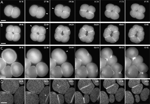 Figure 1. A zone of RhoA activity in echinoderm and amphibian cytokinesis. (A) Surface view of four-cell purple urchin embryo; projection of 18 1-μm sections. eGFP-rGBD begins to accumulate immediately before furrowing (arrowheads), brightens, and disappears once furrows are complete. (B) Surface view of eight-cell purple urchin embryo; projection of 18 1-μm sections. eGFP-rGBD accumulates before the furrow appears (arrowheads) at the site of the future furrow. (C) Sectional view through eight-cell green urchin embryo; projection of 16 1-μm sections. Before cleavage (00:00), eGFP-rGBD reveals uniform, cortical RhoA activity, which disappears (02:40) before localized activation of RhoA in the equator (arrowhead, 04:40), where the furrow will develop (06:40). (D) Surface view of X. laevis embryo; projection of 12 sections. eGFP-rGBD appears in narrow stripes (arrowheads) that presage furrow formation. See online supplemental material for Videos corresponding to B–D (Videos 1–3, respectively, available at http://www.jcb.org/cgi/content/full/jcb.200501131/DC1). Times are given in minutes:seconds after filming began. Bars, 25 μm. |