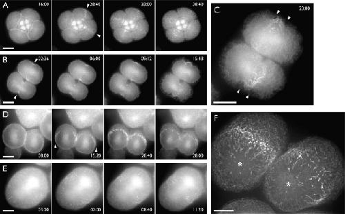 Figure 4. RhoA activation in the equator does not depend on actin assembly. All times in this figure are in minutes:seconds after the addition of cytochalasin D. (A) Projection of 18 1-μm sections through a 16-cell purple urchin embryo treated with 10 μM cytochalasin D during prometaphase. As the drug takes effect, cell surfaces become spiked and ruffled. Cells fail to develop a furrow but, nevertheless, form zones of RhoA activation (arrowheads, 28:40). Bright, glowing objects in other blastomeres are nuclei that accumulate eGFP probes nonspecifically (see Fig. 2, C and D). (B) Projection of four sections through a purple urchin embryo to which 10 μM cytochalasin D was added shortly before furrowing. Furrows with associated RhoA activity develop (arrowheads) and regress, but equatorial RhoA activity remains high despite furrow regression. (C) Projection of 20 sections through the near surface of the embryo shown in B; although the cortex of cytochalasin Dâtreated cells is wildly deranged, RhoA remains elevated in the equator (arrowheads). (D) Projection of 15 sections through a green urchin embryo to which 10 μM cytochalasin D was added at metaphase. Zones of RhoA activity (arrowheads) appear on schedule despite the absence of ingression. (E) A more extreme case than D; projection of 10 1-μm sections through one blastomere of an eight-cell green urchin embryo attempting to cleave in 12-μM cytochalasin D. Active RhoA appears on tubular extensions projecting inward from the cortex, most prominently near the equator. (F) Projection of 38 sections through an eight-cell green urchin embryo treated identically to that in E. Tubular projections point toward the spindle poles (asterisks). See online supplemental material for videos corresponding to A (Video 6) and E (Video 7, available at http://www.jcb.org/cgi/content/full/jcb.200501131/DC1). Bars, 25 μm. |