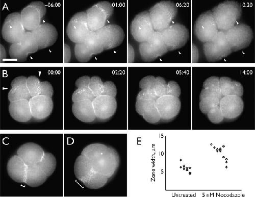 Figure 5. Microtubule disruption disrupts RhoA zone. (A) Projection of seven sections through a purple urchin embryo, which was first treated with 12 μM cytochalasin D immediately before furrowing, and then treated with 25 μM nocodazole at the time the furrows began to regress (00:00). Nocodazole causes rapid abolition of RhoA zones (arrowheads). Bar, 25 μm. (B) Projection of 18 sections through purple urchin embryo cultured in 5 nM nocodazole for 30 min before filming. Furrows in top two cells are associated with uneven, poorly bounded zones of RhoA activity (arrowheads, 00:00). Zones subsequently fragment, and furrows regress. (C) Projection of 18 sections through a control purple urchin embryo showing normal width and brightness of the RhoA zone during telophase. (D) Projection of 18 sections through a four-cell purple urchin embryo cultured in 5 nM nocodazole. The RhoA zone is much wider than controls (compare brackets in C and D). (E) Scatter plot showing that RhoA zones are consistently wider in embryos treated with 5 nM nocodazole. Zones were measured at the point just after ingression begins (exemplified by the lower left furrows in C and D) in four untreated and six treated embryos of equivalent developmental stage (four and eight cell) from identical experiments on two successive days. Measurements from the same embryo are aligned vertically. Control and nocodazole-treated cells are significantly different (t test: P = 10−6). |