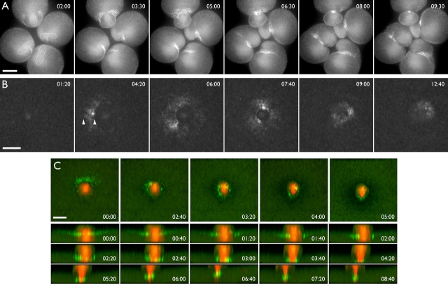 Figure 3. RhoA zones accompany divergent forms of cytokinesis. (A) Micromere formation in green urchin embryos. Projection of 12 1-μm sections of an eight-cell green urchin embryo. Dashed outlines in first frame show spindle position and orientation. Cell at top forms a circumferential furrow above the spindle midplane; in other cells, the asymmetric position of the spindle corresponds to asymmetric furrowing, and the region of concentrated eGFP-rGBD spreads around the circumference as furrowing proceeds. (B) Polar body formation in X. laevis oocytes. Projection of 13 optical sections showing that eGFP-rGBD becomes concentrated in a circular region at the animal pole and constricts inward. Arrowheads indicate edges of zone. (C) Dual-labelled images from projection of 13 optical planes showing tubulin (red) and eGFP-rGBD (green) during polar body emission. Top row shows facing view; circular region of concentrated eGFP-rGBD closes inward around microtubules of the first meiotic spindle. Bottom three rows show Z view in which eGFP-rGBD is seen to contract inward and downward in concert with the closure of the cytokinetic array, which pinches off the forming polar body. The microscope was refocused at 05:20 to allow the eGFP-rGBD ring to be followed deeper into the cytoplasm. See online supplemental material for videos corresponding to A (Video 4) and C (Video 5, available at http://www.jcb.org/cgi/content/full/jcb.200501131/DC1). All times are in minutes:seconds after filming began. Bars, 25 μm. |