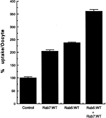 Figure 9. Rab5- and Rab7-coinjected cells produced additive effects. Oocytes were injected with 50 ng of Rab5 and Rab7 alone or in combination and incubated for 2 h at 18°C. The cells were incubated with 2 mg/ml of HRP for 1 h at 18°C to determine the rate of HRP uptake. Results are expressed as percentage of uptake per oocyte with respect to control (205 ng per oocyte) ±SD (average of eight experiments).