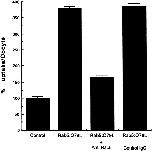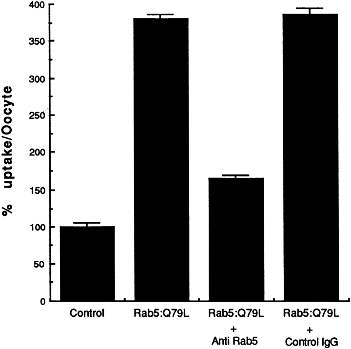 Figure 4. Inhibition of HRP uptake by anti-Rab5 antibody. The oocytes were injected with Rab5:Q79L (100 ng) alone or with anti-Rab5 antibody (200 ng). HRP uptake was followed as described in Fig. 1. Results are expressed as percentage of control uptake (150 ng per oocyte) from the average of eight experiments.