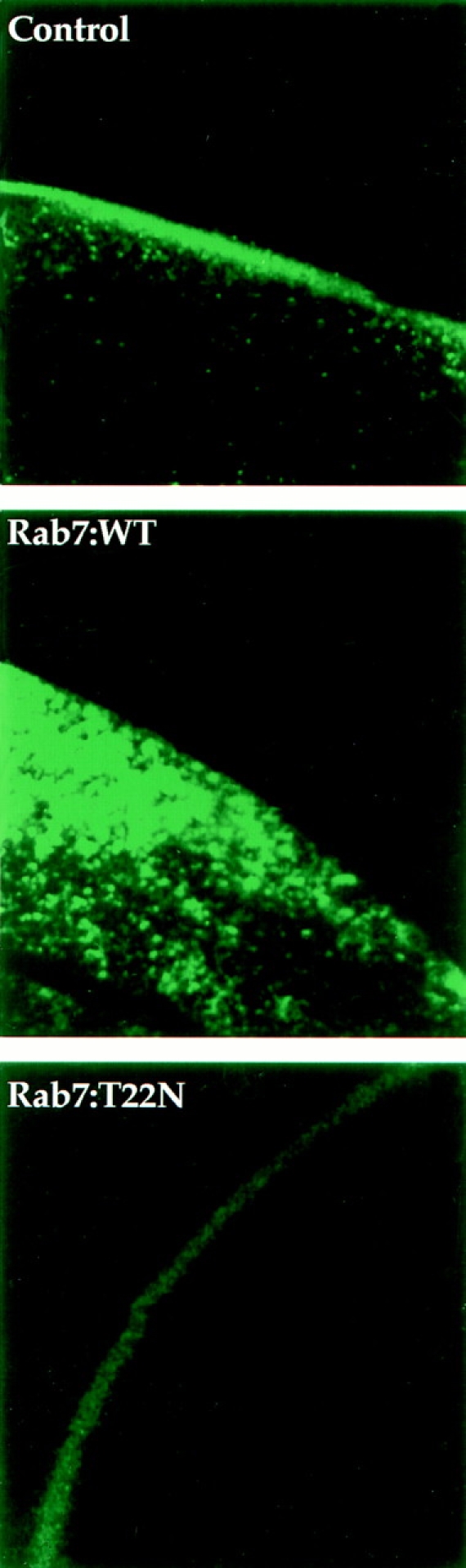 Figure 8. Rab5 regulation of endocytosis is upstream of Rab7. (a) Rab5 proteins were injected alone (50 ng) or in combination with both mutants (100 ng) of Rab5 and Rab7. (b) Rab7 proteins (50 ng) were injected alone or in combination with both mutants (100 ng) of Rab5 and Rab7. Results are expressed as percentage of control uptake by uninjected oocytes (average of eight experiments).