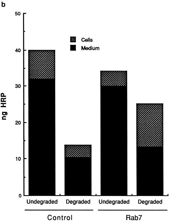 Figure 7. Rab7-mediated inactivation/degradation of HRP by oocytes. (a) Oocytes were preloaded with HRP by incubating with HRP (2 mg/ml) for 1 h at 18°C. Preloaded cells were washed and incubated with 100 μM monensin or control buffer as indicated for 1 h at 18°C. The cells were then injected with 100 ng of the respective fusion proteins. HRP activity present in the cells was measured after a 2-h incubation at 18°C. Results are expressed as percentage of control (110 ng HRP/oocyte) from the average of eight experiments. (b) Oocytes were incubated with 125I-HRP (0.5 mg/ml; 2 × 105 cpm/μg) for 1 h at 18°C and washed three times to remove unbound radioactivity. Subsequently, the cells were injected with 100 ng of Rab7:WT protein or control buffer, and nine oocytes were incubated in 300 μl of MBS for 2 h at 18°C. Oocytes were washed and solublized in PBS containing 0.1% Triton X-100, and TCA-soluble and -precipitable radioactivity was determined in cell lysates and media. Results are expressed as ng of HRP associated with or degraded by the cells.