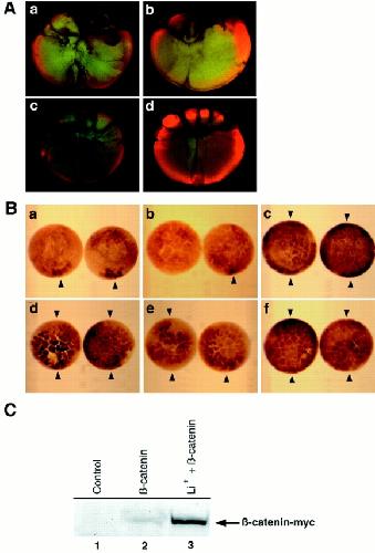 Figure 8. Effects of Xgsk-3 and LiCl on the spatial accumulation of β-catenin. (A) The dorsoâventral asymmetry in β-catenin requires the postfertilization cortical rotation and is regulated by Xgsk-3. When the postfertilization cortical rotation is prevented by UV-irradiation of the vegetal pole during the first cell cycle (a), 32-cell embryos do not display dorsal enrichments in β-catenin observed in control embryos (b), and some show ventral increases. Injection of 4 ng of RNA encoding Xgsk-3 into the dorsal marginal zone of four- to eight-cell embryos also blocks the dorsal increase in β-catenin staining at the 32-cell stage (c). Conversely, injection of 4 ng of RNA encoding a dominant negative Xgsk-3 into the ventral marginal zone promotes accumulation of β-catenin throughout the 32-cell embryo (d). (B) Injection of a mixture of prolactin and β-cateninâmyc RNAs leads to the accumulation of β-cateninâmyc on the future dorsal side of the embryo (a), though the RNAs are injected and expressed throughout the embryo. Decreased staining (left embryo) or staining for β-cateninâmyc similar to controls (right embryo) is evident when Xgsk-3 RNA is injected with the β-cateninâ myc RNA (b). Inhibition of endogenous Xgsk-3 by injecting dnXgsk-3 RNA increases and expands the accumulation of ectopic β-cateninâ myc to the entire embryonic marginal zone (c). Treatment with lithium also expands the domain of β-cateninâmyc accumulation in embryos overexpressing prolactin (d) or Xgsk-3 (e). Expression of ptβ-cateninâmyc (which encodes a form of β-catenin that is not phosphorylated by Xgsk-3; Yost et al., 1996) with control prolactin results in the accumulation of ptβ-cateninâmyc everywhere in the embryo (f). In these experiments 1 ng of β-cateninâmyc or ptβ-cateninâmyc RNA mixed with 3 ng of prolactin, Xgsk-3, or dnXgsk-3 RNA was injected into the marginal zone of each blastomere of fourcell embryos. Arrowheads denote dorsal (single arrowhead) or dorsal and ventral (two arrowheads) staining. (C) Lithium treatment increases steady-state levels of β-cateninâmyc expressed from injected RNA. Embryos were injected and treated with LiCl as in Materials and Methods. At stage 6.5â7, embryo extracts were prepared and probed for the c-myc epitopeâtagged β-catenin by Western blot analysis. Lane 1, Uninjected controls do not express β-cateninâmyc; lane 2, embryos injected with β-cateninâmyc RNA express the encoded protein; lane 3, injection of β-cateninâmyc RNA as in lane 2 followed by treatment with LiCl leads to greater accumulation of β-cateninâmyc. |