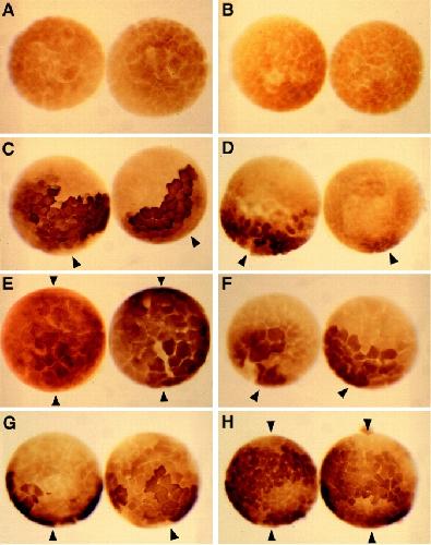 Figure 5. Wnts, but not BVg1 or noggin, are able to modulate ectopic β-cateninâmyc accumulation both before and after MBT, as assayed by antiâc-myc immunostaining. Uninjected controls do not stain for c-myc when assayed before (A) or after (B) MBT. Embryos expressing β-cateninâmyc and prolactin display a dorsal accumulation of ectopic β-cateninâmyc both before (C) and after (D) MBT, while the ventral side shows negligible staining. (E) Xwnt-8 RNA expands the domain of accumulation of β-cateninâmyc when assayed before MBT (shown, 100 pg Xwnt-8 RNA was injected for the embryo on the left, and 3 ng RNA for the embryo on the right) or after MBT (see Table I). (F) Neither BVg1 (pre-MBT, shown; and post-MBT, Table I) nor noggin RNA (see Table I) are able to elevate β-cateninâmyc accumulation on the ventral side, while β-cateninâmyc accumulates on the dorsal side similarly to control embryos. (G) Xwnt-5A RNA does not alter the pattern of β-cateninâmyc accumulation during the early cleavage stages, but causes β-cateninâmyc to accumulate around the entire marginal zone after MBT (H). In these experiments, 1 ng of β-catenin RNA and 3 ng of prolactin, Xwnt-8 (100 pg in left embryo of panel E), Xwnt-5A, BVg1, or noggin RNA were injected into the marginal zone of each blastomere of four cell stage embryos, followed by antiâc-myc immunostaining before and after MBT. Arrowheads denote dorsal (single arrowhead) or dorsal and ventral (double arrowhead) staining. |