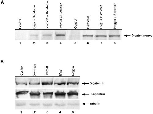Figure 6. Xwnt-8, but not BVg1 or noggin, is able to increase the accumulation of both ectopic and endogenous β-catenin as assayed by Western blots. (A) In multiple independent experiments (see text), probing Western blots for c-myc, microinjection of 100 pg of β-cateninâmyc RNA with 200 pg of β-galactosidase (lane 2), Xwnt-11 (lane 3), or Xwnt-8 (lane 4) reveals that only Xwnt-8 is able to increase β-catenin levels (compare lanes 2 and 4). Uninjected embryos (lane 1) do not express the c-myc epitope. In separate experiments (lanes 5â8), neither BVg1 (lane 7) nor noggin (lane 8) increases the accumulation of β-catenin above control-injected levels (lane 6), while uninjected embryos do not express β-cateninâmyc (lane 5). (B) Microinjection of 5â10 ng of control prolactin (lane 1), Xwnt-5A (lane 2), Xwnt-8 (lane 3), BVg1 (lane 4), or noggin (lane 5) RNA demonstrates that Xwnt-8 increases the steady state levels of endogenous β-catenin (compare lanes 1 and 3), as shown above for ectopic β-catenin. In these experiments, the animal poles of two-cell embryos were injected with RNA, followed by the extraction of protein before stage 7. To control for protein content and even loading, all endogenous β-catenin bands were normalized to both α-spectrin and tubulin signals from the same Western blot. |