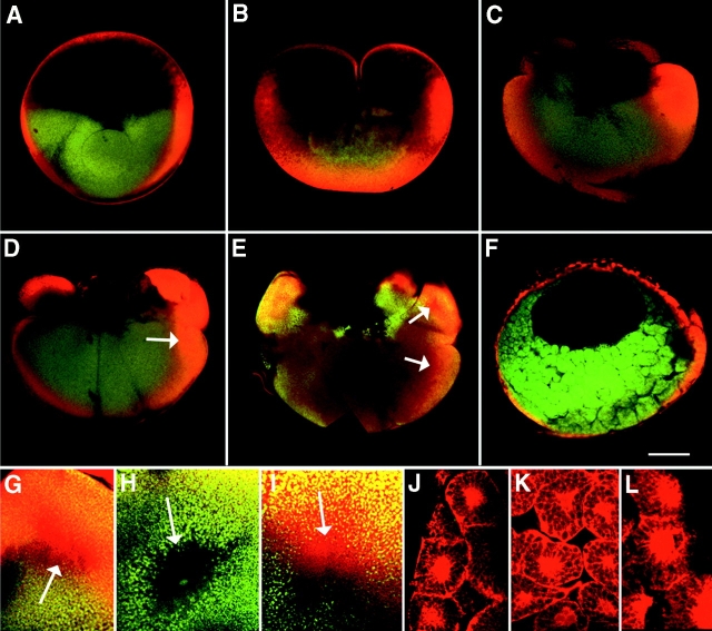 Figure 2. Spatial and temporal distribution of β-catenin (catenin beta 1) during early development of the Xenopus embryo. Embryos were bisected along the dorso-ventral axis after immunolabeling so that each half contained dorsal and ventral blastomeres. Each half was imaged from the bisected surface in the confocal microscope. Embryos are oriented with dorsal on the right, ventral on the left, animal hemisphere at the top, and vegetal hemisphere at the bottom, in AâF. Immunocytochemistry reveals an increase in cytoplasmic β-catenin (orange) on the dorsal side of the embryo from the two-cell (A), to four-cell (B), to eight-cell (C) stages. At the 16-cell stage, intense β-catenin is observed in the cytoplasm (D, arrow denotes nucleus) as well as in the nucleus (G, arrow) of the dorsal vegetal blastomeres. At the 32-cell stage, β-catenin is enriched in the cytoplasm (E, arrows denote nuclei) and nuclei (I, arrow) of all dorsal blastomeres, while ventral blastomeres have lower cytoplasmic staining (E) but neglible nuclear staining (H, arrow). Overall, 93% of the embryos analyzed (n = 120) from the 2â32-cell stages displayed this dorsal enrichment of β-catenin. At the blastula stage, β-catenin is detected in the cytoplasm of both dorsal and ventral cells (F), as well as in ventral (J) and dorsal (L) nuclei, though the dorsal signal was stronger in both cellular compartments. Primarily the outer layers of blastomeres demonstrate intense cytoplasmic β-catenin staining, even when blastula were bisected before immunolabeling to assure access of the antibodies to the inner blastomeres. Specific β-catenin staining is detectable in these inner vegetal blastomeres (K) when fluorescence sensitivity is increased to the point where the dorsal signal becomes saturated. |