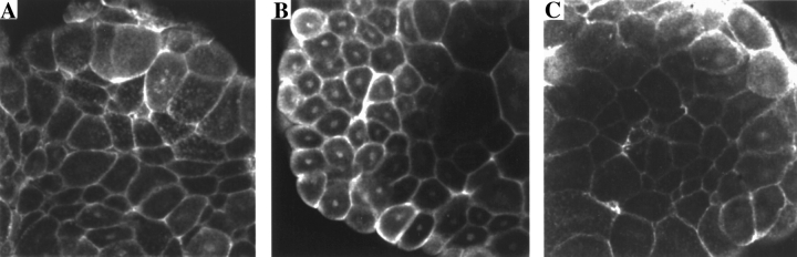 Figure 7. Xwnt-8, but not Xwnt-5A, increases the accumulation of endogenous β-catenin in nuclei. The animal pole of each blastomere at the two-cell stage was injected with RNA encoding prolactin (A), Xwnt-8 (B), or Xwnt-5A (C). At stage 6.5â7 animal cap explants were isolated, fixed, and processed for immunolocalization of endogenous β-catenin. |