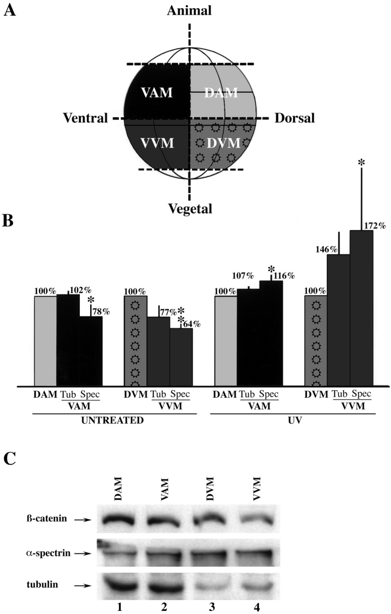 Figure 4. Western blot analysis of microdissected 32-cell Xenopus embryos reveals a dorso-vegetal enrichment of β-catenin. (A) Schematic diagram of how embryos were dissected into dorsal animal marginal (DAM; light gray), ventral animal marginal (VAM; black), dorsal vegetal marginal (DVM; pattern), and ventral vegetal marginal (VVM; dark gray) portions. (B) Dorsal steady-state levels of endogenous β-catenin are greater than ventral levels in untreated but not in UV-ventralized embryos. On average, the VVM portions from untreated embryos contained 77% (normalized to tubulin, three experiments) and 64% (normalized to spectrin, five experiments) as much β-catenin as the DVM zones. The VVM portions dissected from UV-irradiated embryos contained more β-catenin relative to their dorsal counterparts; 146% (normalized to tubulin, four experiments) and 172% (normalized to spectrin, four experiments). Spectrin-normalized steady-state levels of β-catenin in the VAM zone were also lower than the DAM region in untreated embryos (78%, five experiments). These differences were eliminated with UV treatment (four experiments for both tubulin and spectrin normalization). The asterisks indicate that the difference in β-catenin content between the dorsal and ventral marginal zones is statistically significant, as determined by Student's t-test (P < 0.05 for a single asterisk, P < 0.005 for a double asterisk). The error bars represent the standard error. (C) Representative Western blot detecting endogenous β-catenin, α-spectrin, and tubulin. Ventral levels of β-catenin are lower in the dissected VAM (lane 2) relative to the DAM (lane 1) regions, and in the VVM (lane 4) relative to DVM (lane 3) regions. It is worth noting that the dissected quadrants of the embryo do not precisely correspond to the areas of maximal β-catenin staining determined by confocal microscopy. Moreover, the thresholds of fluorescence chosen for Figs. 1 and 2 were set high, so as not to saturate the dorsal-ventral differences, and as a result these images do not show the detectable lower levels of cytoplasmic and membrane-associated β-catenin, which nevertheless would contribute to the signals on Western blots. Thus, one cannot quantitatively compare the dorso-ventral differences monitored by the dissections vs. confocal microscopy. |