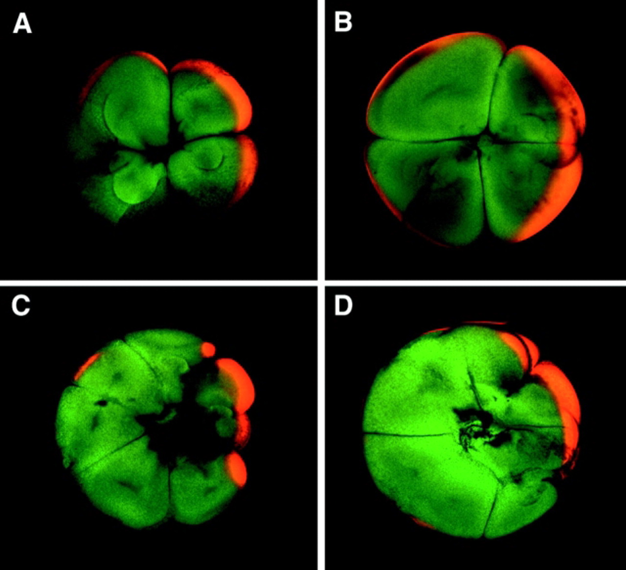 Figure 1 Immunolocalization of β-catenin in early Xenopus embryos. Whole-mount staining with antibody to β-catenin demonstrates greater staining on the dorsal side of embryos (to the right in all panels) at the 8- (A and B) and 16-cell (C and D) stages. Immunolabeled embryos were cut along the equator separating the animal (A and C) from vegetal (B and D) blastomeres and examined with a confocal microscope. Optical sections through these blastomeres demonstrate an arc of cytoplasmic β-catenin in the periphery of the animal dorsal blastomeres (A and C) and vegetal dorsal blastomeres (B and D). Ventral blastomeres stain for β-catenin at the cell surface but not in the cytoplasm. |
