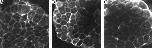 Figure 3. Immunolocalization of proteins unrelated to β-catenin. To assess whether the patterns of β-catenin observed in the eight-cell embryo (Fig. 1) were unique or were shared by other proteins, we undertook a comparable analysis of eight-cell embryos stained with other antibodies, optically sectioned near the equator, and viewed at low magnification to monitor dorsoventral patterns (AâC) or viewed at the membrane at high magnification (DâF). Dorsal is to the right for A, B, and C as in Fig. 1. While eight-cell embryos show a clear dorsal enrichment of β-catenin (Fig. 1, A and B), membrane skeleton protein 4.1 (A), α-spectrin (B), and cytokeratin (C) antibodies show no dorsal enrichment. The α-spectrin image in B is somewhat more pigmented in the animal hemisphere than the other images, hence the ventral blastomeres appear somewhat darker than the dorsal blastomeres (right) owing to pigmentation differences. The cytokeratin image is yellow because of the extensive overlap of the green autofluorescence signal with the red cytoplasmic staining of the antibody (see F for cytoplasmic stain at higher magnification). While β-catenin staining extends extensively from the membrane through the cytoplasm at the eight-cell stage (Fig. 1, A and B), both protein 4.1 (D) and α-spectrin (E) are restricted to the plasma membrane, which is consistent with their known functions in the membrane skeleton, while the cytokeratin staining extends into the cytoplasm (F) as filaments as previously noted (Klymkowsky et al., 1987), though our fixation methods also retain nonpolymeric protein and increase nonfilamentous cytokeratin staining. |