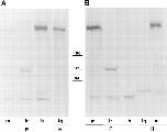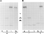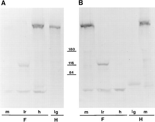 Figure 2 Western blot analysis of human and Xenopus utrophin (A) and dystrophin (B). The Xenopus (frog, F) tissues analyzed were skeletal muscle (m), liver (lr), and heart (h), and the human (H) tissues were skeletal muscle and lung (lg). Positions of molecular mass markers at 180, 116, and 84 kD are shown, while utrophin and dystrophin migrate at â¼400 kD. Lower molecular mass bands at â¼50 and 120 kD are nonspecific and due to cross reactions of the second antibody system. |