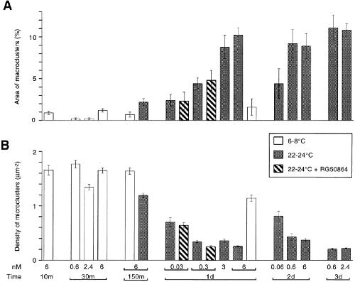 Figure 6 Effect of laminin treatment on (A) the percentage of surface area occupied by LBS macroclusters and (B) the density of LBS microclusters. Laminin concentrations (in nM) and exposure times are indicated at the bottom of B. The cultures were treated with laminin either at low temperature (open columns) or at room temperature (shaded columns). In some cases the laminin treatment was carried out in the presence of RG50864 (striped columns). On average the means and standard errors are based on 26 cells (range, 9–79). |