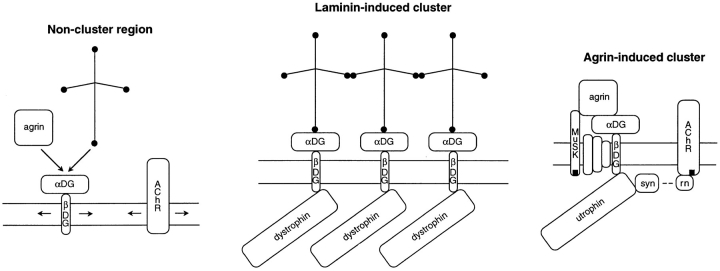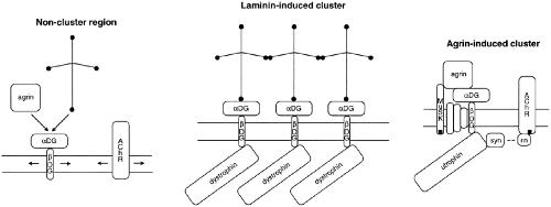 Figure 12 Schematic representation of some of the surface proteins clustered by laminin and agrin, both of which bind to αDG. Before clustering, DG complexes of αDG and βDG are considered to be mobile, like AChRs. Laminin-induced clusters of DG and dystrophin are considered to be linked by lamininâlaminin binding. They do not contain utrophin, AChRs, or tyrosine phosphorylated molecules. Not shown is that the end of the vertical short arm of laminin also participates in self binding; that laminin may bind to other sarcolemma-associated molecules; that dystrophin binds to cytoskeletal actin; and that sarcoglycans and syntrophins may also be present at laminin-induced clusters. Agrin-induced clusters contain DG, sarcoglycans (unlabeled), utrophin, β2 syntrophin (syn), tyrosine phosphorylated AChRs, rapsyn (rn), and tyrosine phosphorylated muscle specific kinase (MuSK). Their formation unlike the formation of laminin-induced clusters, involves stimulation of tyrosine kinase activity. |