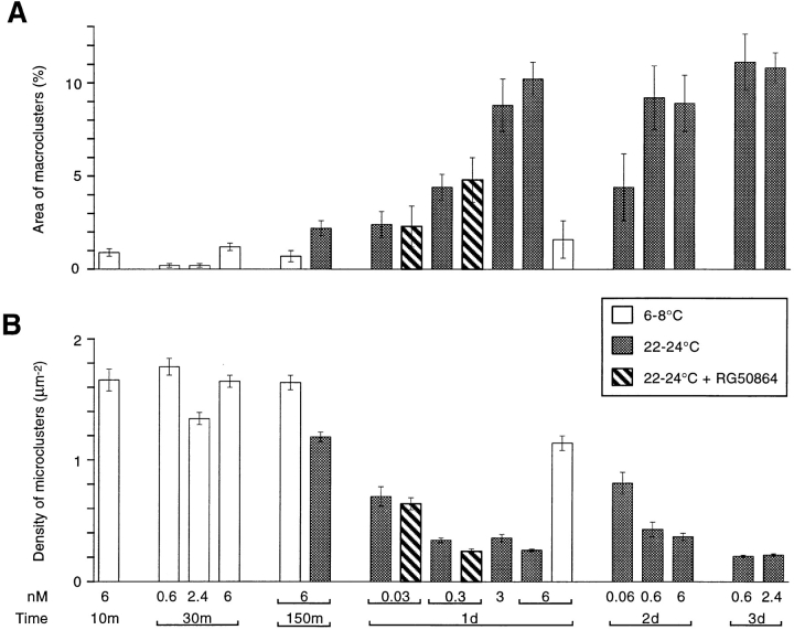 Figure 6. Effect of laminin treatment on (A) the percentage of surface area occupied by LBS macroclusters and (B) the density of LBS microclusters. Laminin concentrations (in nM) and exposure times are indicated at the bottom of B. The cultures were treated with laminin either at low temperature (open columns) or at room temperature (shaded columns). In some cases the laminin treatment was carried out in the presence of RG50864 (striped columns). On average the means and standard errors are based on 26 cells (range, 9–79). |