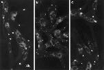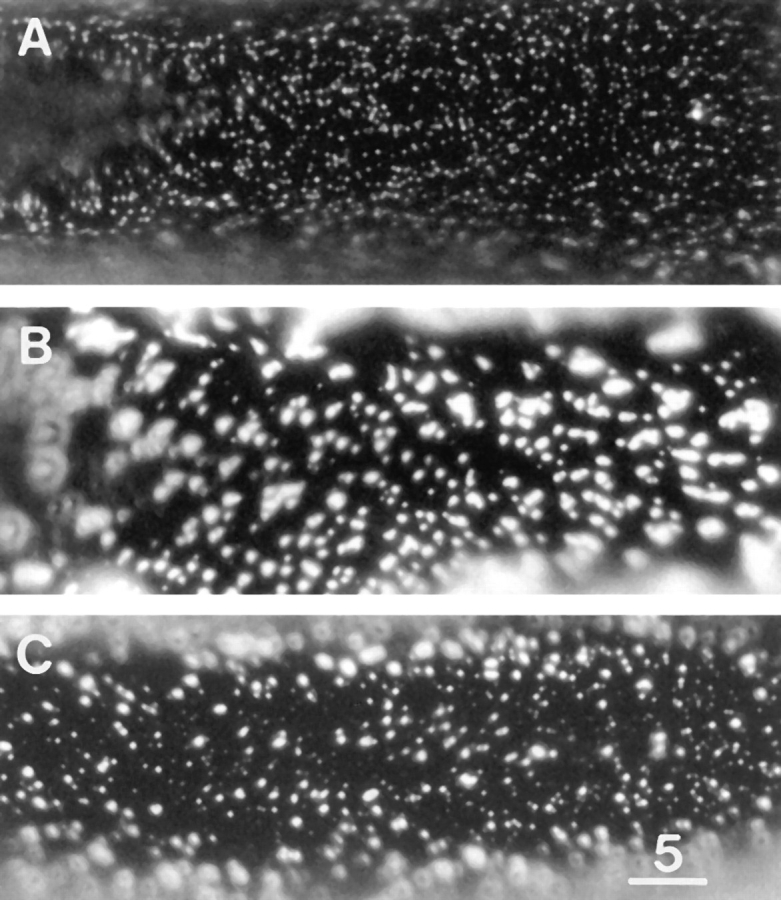 Figure 8 E3 lacks clustering activity and inhibits laminin-induced clustering. (A) E3 binding sites after treatment with 3.3 μM E3 for 2 d. Note the relatively high density of microclusters and the paucity of macroclusters. (B) LBS after treatment with 0.6 nM laminin for 1 d. (C) Laminin and E3 binding sites after treatment with 0.6 nM laminin and 3.3 μM E3 for 1 d. E3 inhibited the laminininduced clustering. Bar, 5 μm. |