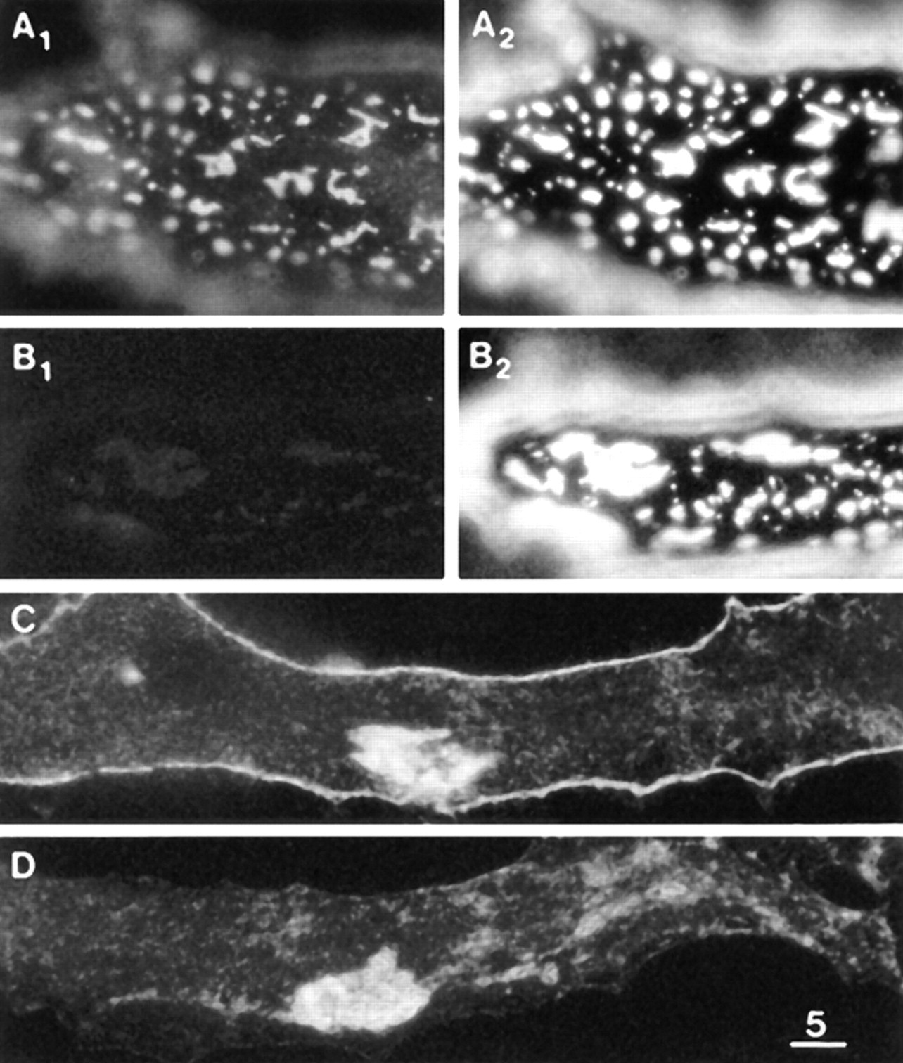 Figure 3. Distribution of DG and LBS on the dorsal surface of muscle cells in control cultures. (A) αDG immunofluorescence, revealing microclusters and a few macroclusters. (B1) βDG immunofluorescence. Part of a megacluster is seen. Microclusters are also apparent but are relatively faint. (B2) LBS immunofluorescence in same field as B1. Microclusters, as well as the megacluster, are well resolved. (C) Laminin immunofluorescence in the absence of pretreatment with laminin, revealing a megacluster but very few microclusters. (D1 and D2) αDG and LBS immunofluorescence, obtained by exposing the culture to 6 nM laminin for 10 min at low temperature, followed by staining for αDG and laminin. The brief pretreatment with laminin inhibited the staining for αDG (compare D1 with A). Bar, 5 μm. |