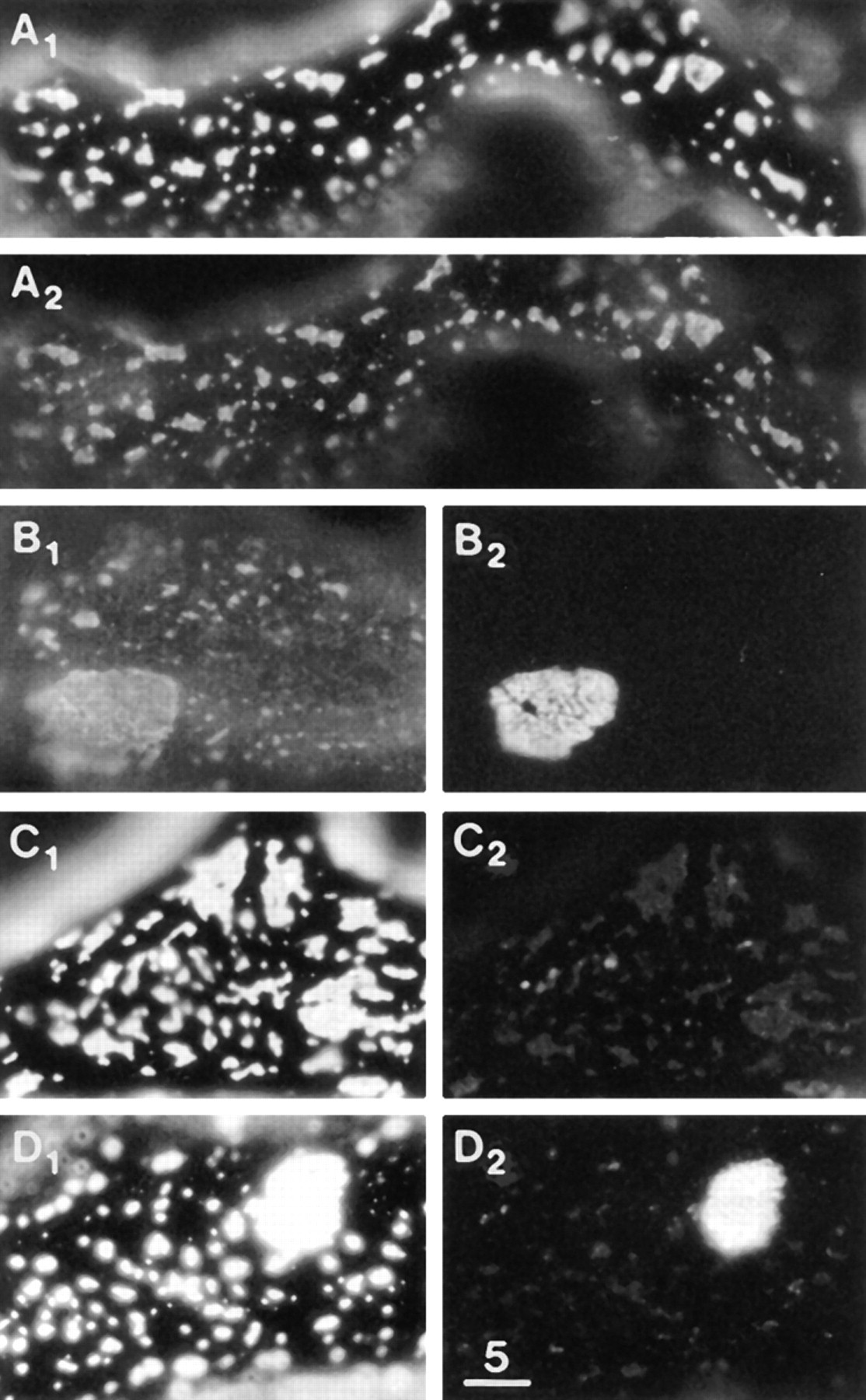 Figure 3 Distribution of DG and LBS on the dorsal surface of muscle cells in control cultures. (A) αDG immunofluorescence, revealing microclusters and a few macroclusters. (B1) βDG immunofluorescence. Part of a megacluster is seen. Microclusters are also apparent but are relatively faint. (B2) LBS immunofluorescence in same field as B1. Microclusters, as well as the megacluster, are well resolved. (C) Laminin immunofluorescence in the absence of pretreatment with laminin, revealing a megacluster but very few microclusters. (D1 and D2) αDG and LBS immunofluorescence, obtained by exposing the culture to 6 nM laminin for 10 min at low temperature, followed by staining for αDG and laminin. The brief pretreatment with laminin inhibited the staining for αDG (compare D1 with A). Bar, 5 μm. |