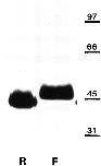 Figure 1. Western blot analysis of rabbit and Xenopus βDG. Nitrocellulose transfers of heavy microsomes from rabbit (R) and Xenopus (frog, F) muscle, which had been separated by SDSPAGE, were stained with mAb 43DAG1/8D5 raised to 15 of the last 16 amino acids at the extreme COOH terminus of the human dystroglycan sequence. It recognizes a band of roughly 43 kD in rabbit corresponding to the size of βDG (Ibraghimov-Beskrovnaya et al., 1992). A similar though somewhat larger band of 44–46 kD is visible in Xenopus. Molecular mass markers (in kD) are shown to the right. |