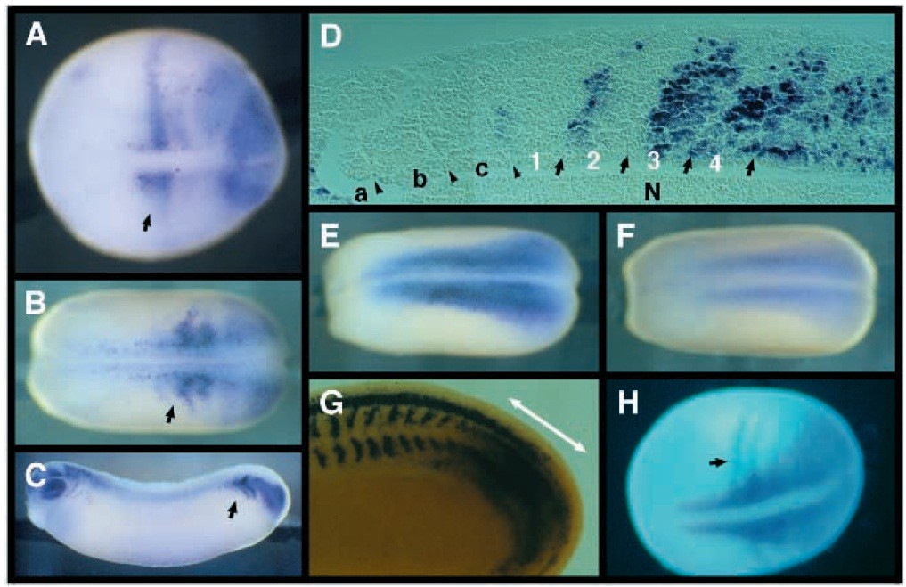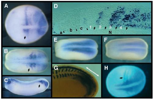 actin (E) and of MyoD (F). (G) Expression of X-Notch-1 RNA in the presomitic mesoderm (double arrow) in a cleared, early tadpole embryo