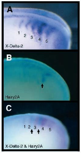(B) Hairy2A, or (C) both X-Delta-2 (purple, numbers) and Hairy2A