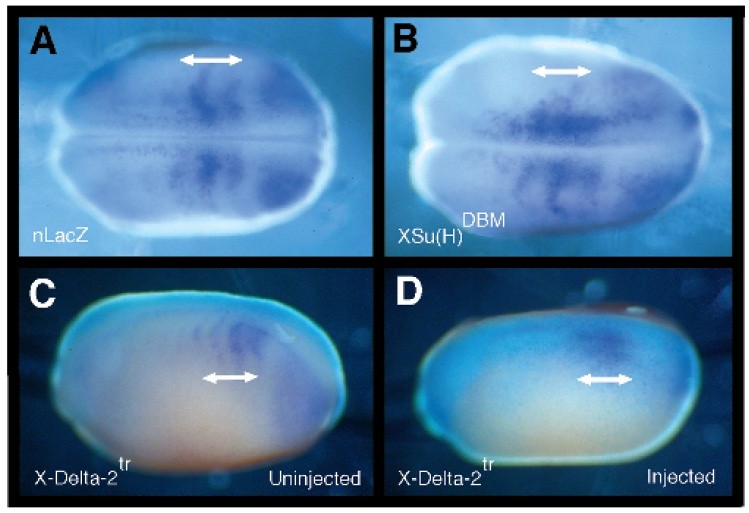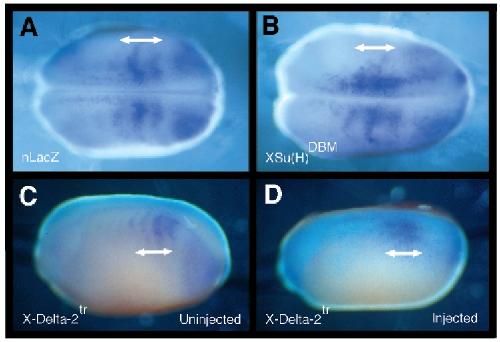 (C,D) Embryo injected with a mixture of nlacZ and X-Delta-2tr