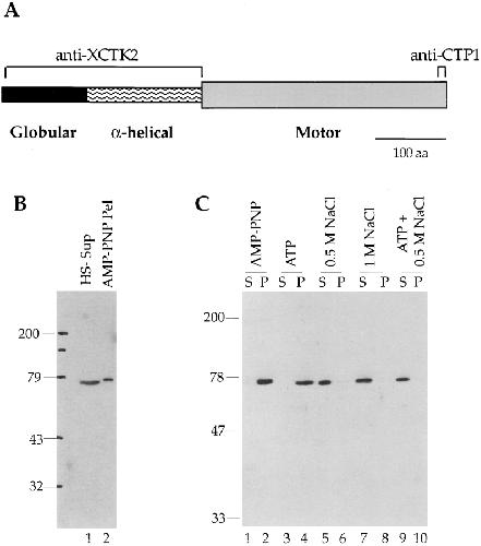 Figure 2. XCTK2 contains a COOH-terminal motor domain and binds microtubules. (A) A schematic representation of the predicted structure of XCTK2. XCTK2 contains an NH2-terminal globular domain, a central α-helical stalk and a COOH-terminal motor domain. (B and C) Immunoblots of microtubule pelleting assays in Xenopus egg extracts. (B) Xenopus egg high speed supernatants (lane 1) or AMP-PNP microtubule pellets (lane 2) were probed with anti-CTP1 antibody. The slight band shift is due to the high amounts of protein present in the high speed supernatant that alter the migration of XCTK2. (C) Microtubules were polymerized in mitotic high speed supernatants of Xenopus egg extracts and pelleted in the absence of ATP and the presence of AMP-PNP (lanes 1 and 2). The microtubule pellet, with associated proteins, was resuspended and extracted with various nucleotides and salt to generate supernatants (S) and pellets (P) of each extraction condition: 2 mM Mg–ATP (lanes 3 and 4); 0.5 M NaCl (lanes 5 and 6); 1 M NaCl (lanes 7 and 8), or 2 mM Mg–ATP with 0.5 M NaCl (lanes 9 and 10). The blots were probed with anti-XCTK2 antibody.