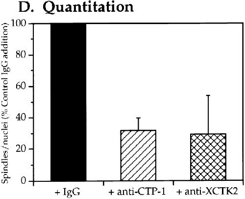 Figure 4. XCTK2 is important for mitotic spindle assembly. Mitotic spindles were assembled in the presence of either (A) 95 μg/ml control IgG, (B) 95 μg/ml anti-CTP1, or (C) 95 μg/ml anti-XCTK2. Spindles were assembled in CSF extracts that contained rhodamine-labeled tubulin and antibody for 60 min and then sedimented onto coverslips. In the presence of antibodies that inhibit XCTK2 function, there is a decrease in the percentage of bipolar spindles that formed. Six random structures were photographed from five fields of view, and they were compiled into the field of view that is shown. To compare between panels, count the number of bipolar spindles versus half spindles in each panel. Rhodamine-labeled microtubules are shown. Bar, 20 μm. (D) Quantitation of XCTK2 immunoinhibition. The percentage of half spindles, bipolar spindles, and aster-like structures that formed per nuclei were quantitated. The data are represented as the percentage of bipolar spindles that formed, normalized to the IgG control addition as 100%. The bars represent mean ± 1 SD (n = 1,020 nuclei for IgG addition [four experiments]; n = 965 nuclei for anti-CTP1 addition [four experiments]; n = 1,007 nuclei for anti-XCTK2 addition [four experiments]).