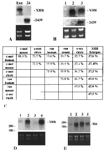 FIG. 2. A: Northern blot analysis showing that XHR mRNA is expressed in the ectoderm of completely exogastrulated embryos (Exe) cultured until sibling embryos reached stage 24 of development. 24: stage 24 sibling embryos. The same blot was reprobed with a neural-specific RNA-binding protein (24-39) (22). B: Northern blot analysis comparing XHRmRNA transcription in disaggregated/reaggregated and untreated animal caps. 1: Ectodermal explants isolated at stage 9 and frozen immediately afterwards. 2: Ectodermal explants isolated at stage 9 but cultured for 30 h. 3: Disaggregated and reaggregated ectodermal explants cultured for 30 h after reaggregation. The same filter was reprobed with a neural-specific RNA binding protein (24-39) (22). C: Results of alignment analysis of all known members of the Met/HGF-receptor family. Numbers indicate the percentage of identity between the deduced amino acid sequences of human c-met, mouse c-met, chick c-met, human and mouse Ron, chick c-sea and Xenopus XHR. D-E: Northern blot analysis showing the tissue-specific expression pattern of XHR (D) and XHL (E)mRNA in adult frogs. 1: Brain; 2: Kidney; 3: Liver; 4: Lung; Ethidium bromide-stained gels were photographed for documentation of RNA loading.