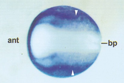 zone. B: dorsal view of a late gastrula. C: anterior view of the same embryo as shown in B. Arrowheads point out a stripe of strong XHR
