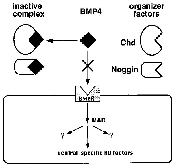 FIG. 3. The organizer factors inactivate BMP-4 by binding it in the extracellular space. Both chordin and noggin bind to BMP-4 and inhibit BMP-4 protein from binding to its own receptor. Down-stream of the BMP receptor, the vertebrate homologue of Drosoph-ila mother against dpp (MAD) seems to play a fundamental role in the signal transmission to the nucleus. Among the target genes in the BMPR signaling pathways are ventral-specific homeodomain (HD) proteins. Both MAD and ventral HD factors can mimic the ventralizing activity of BMP-4 by microinjection. |