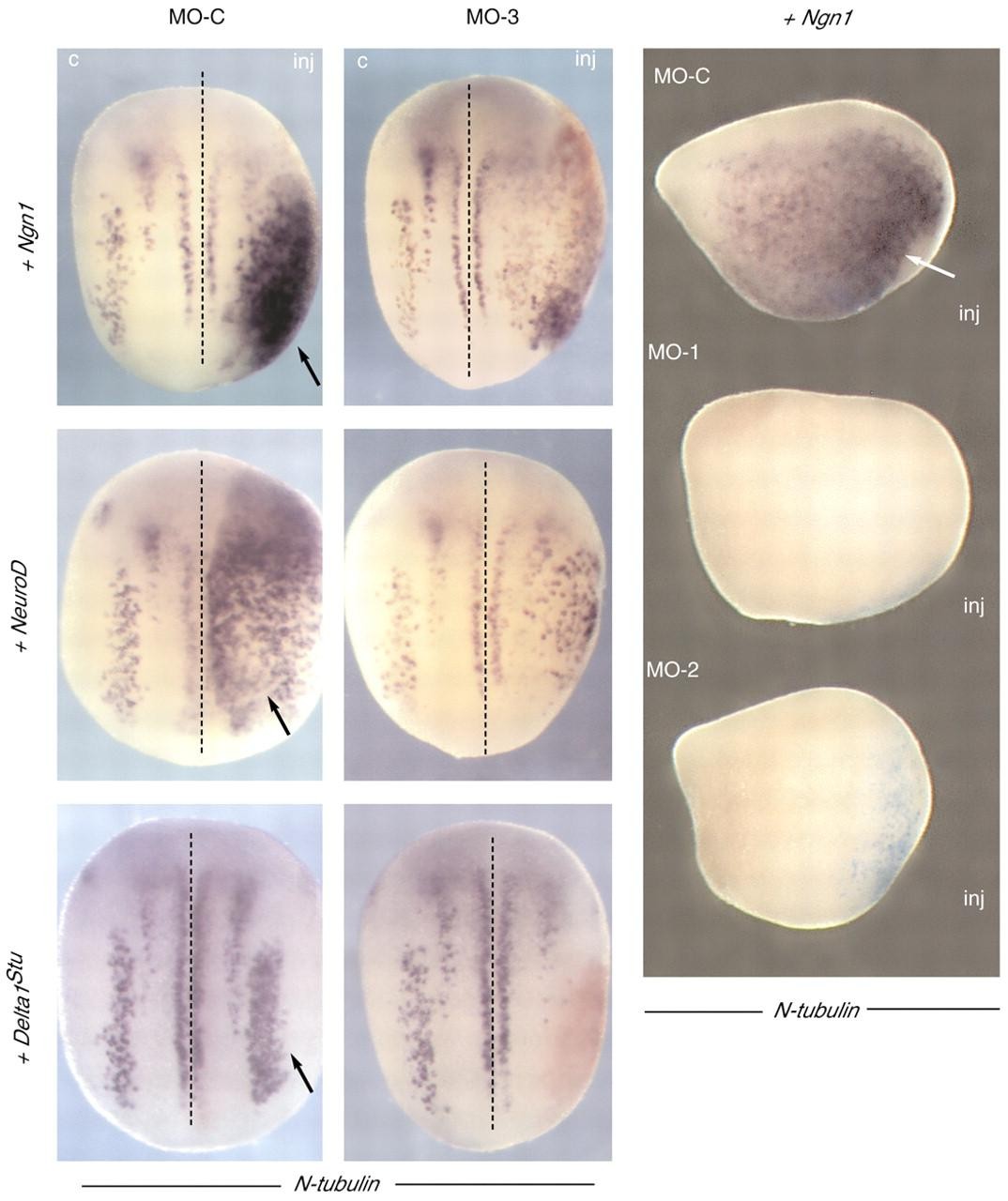 Fig. 3. Gli1, Gli2 and Gli3 are required for ectopic neurogenesis by activated neurogenic pathways. (Left panels) N-tubulin expression (purple) on stage 14-15 embryos co-injected (inj.) with Ngn1, NeuroD or Delta1Stu and MO-C or MO-3, as indicated. Arrows indicate ectopic neuronal differentiation caused by Ngn1, NeuroD or Delta1Stu. Panels show dorsal views and the β-gal injection tracer is in red/pink for Delta1Stu+MO-3. (Right panel) Lateral views of injected embryos at stage 13 showing the β-gal injection tracer in light blue. Ectopic neurogenesis as determined by N-tubulin expression (purple, arrow) is only detected after injection of 1ng Ngn1a RNA plus MO-C, but not after co-injection of Ngn1a plus MO-1 or MO-2. Dorsal side is upwards, anterior towards the right. |