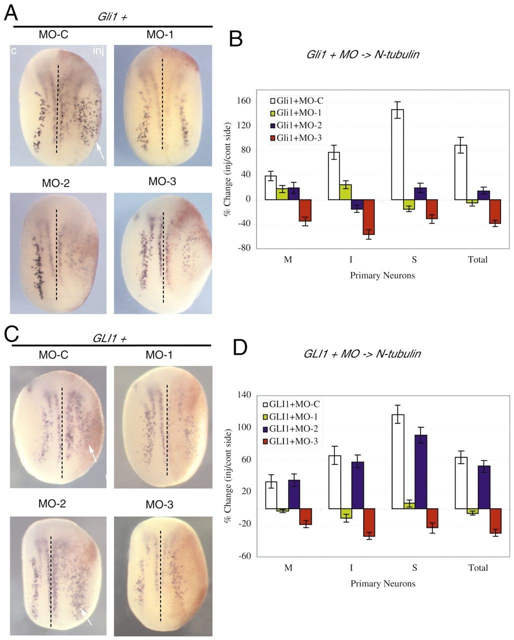 Fig. 4. Gli-induced neurogenesis requires endogenous Gli function. (A,C) N-tubulin expression on stage 14 embryos co-injected (inj.) with Gli1 or human GLI1 and each MO. Arrows indicate ectopic neuronal differentiation. The β-gal tracer is red. (B,D) Percentage change of primary neurons: motoneurons (M), interneurons (I), sensory neurons (S) and total neurons (T) in stage 14 embryos injected with Gli1 (B) or human GLI1 (D) and each MO. Neurons were counted in the embryos that showed a phenotype. The percentage of each cell type was calculated by dividing the number of neurons on the injected side by the number of neurons on the control side. The statistical analysis was performed using Student's t-test. Error bars are s.e.m. |