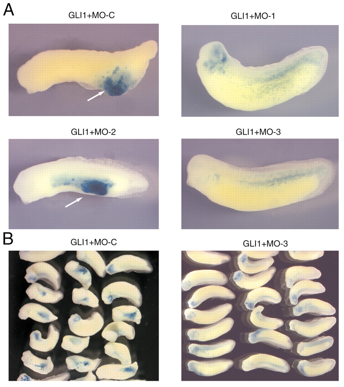 Fig. 5. GLI1-induced tumorigenesis requires endogenous Gli1 and Gli3 function. (A) Tadpoles injected with human GLI1 and each MO. Arrows show tumors in tadpoles injected with GLI1 and MO-C or MO-2. (B) Sets of tadpoles injected with GLI1 and MO-C or MO-3 showing varying overall deformities present in tumor-bearing GLI1+MO-C-injected embryos but absent in GLI1+MO-3-injected siblings. The β-gal tracer is blue. |
