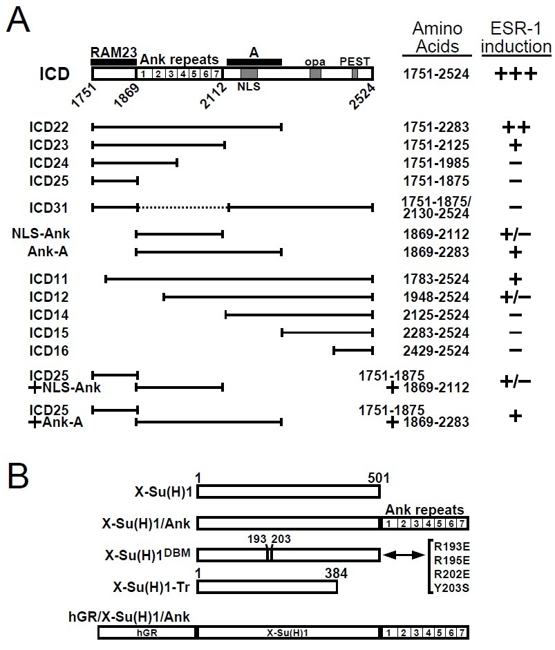 Fig. 1. (A) Deletion analysis of ICD. Diagram of the X-Notch-1