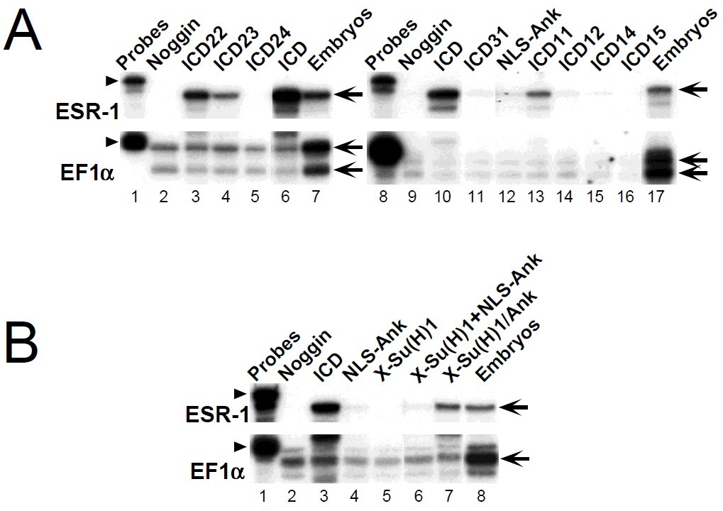 undetectable ESR-1-inducing activity (lane 5) and the ankyrin repeats from ICD (NLS-Ank) have very little inducing activity (lane 4), while XSu(