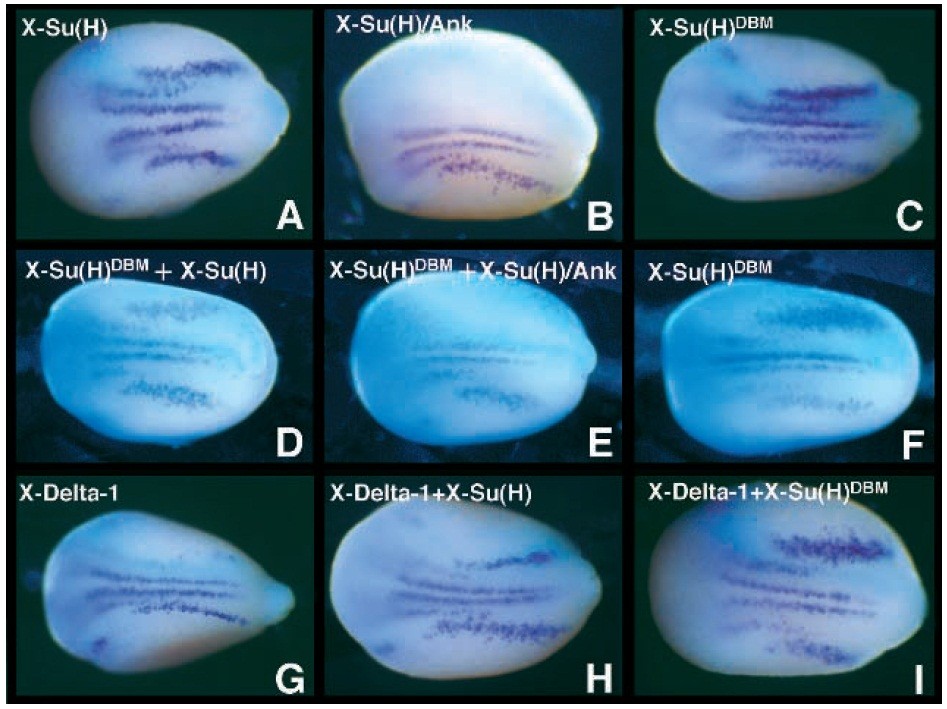 reverses the effects of X-Delta-1; and (I) X-Su(H)1DBM along with X-Delta-1 not only reverses the effects of X-Delta-1 but also results in a neurogenic phenotype. |