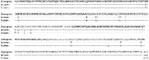 Fig. 4. Comparison of Pax-6 sequence from Xenopus with those from other species. Alignment of the predicted sequences of full-length Pax-6 proteins from Xenopus, mouse and human. A dash (-) indicates identity to the Xenopus sequence. The paired domain (amino acid residues 3-133) and homeo domain (residues 209-269) are in bold. |