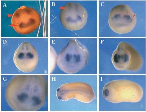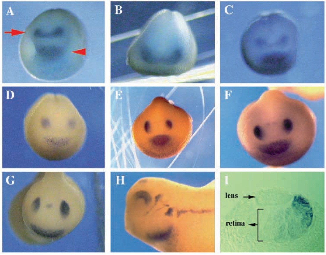 Fig. 3. The expression pattern of ET in Xenopus embryos. A to G show anterior views and H is a lateral view. (A) A stage (st.) 12.5 embryo with a band of expression in the anterior neural plate (indicated by the arrow) and one in the primordium of the cement gland (indicated by the arrowhead). Note that the cement gland stays a single structure (A, C-G), whereas the retina band resolves into two primordia in the next few stages. (B) A st. 15 embryo showing retina field expression. The embryo was oriented to maximize visualization of retina expression and the cement gland is thus hardly visible. (C) A st. 16 embryo with ET expression weaker in the median region of the retina field than that in the lateral regions. (D) A st. 18 embryo with two distinct retina primordia. There is no ET expression in the median region. (E) A st. 19 embryo with no midline expression. (F) A st. 20 embryo. Note that weak expression of ET appears in the pineal gland primordium. The intensity of this signal increases in later stages (see G and H). (G) A st. 22 embryo with ET expression in the retina, the cement gland and the pineal gland (the dot between the two eyes). (H) A st. 26 embryo. The staining in the eye is restricted to the dorsal retina, absent from the lens and the ventral retina. Expression in the cephalic ganglia and lateral line organ also appeared. (I) A transverse section of a st. 28 embryo showing ET expression in the dorsal retina. ET is expressed in all layers of the retina, and completely absent from the lens. Dorsal is to the right. |