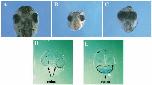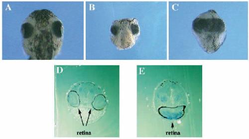 Fig. 7. Effects of removing the prechordal mesoderm on retina formation in Xenopus embryonic explants. (A) A wild-type embryo at st. 35. (B) A st. 35 control explant of the anterior neural plate with the underlying prechordal mesoderm. (C) An anterior neural plate explant without prechordal mesoderm. The explants were isolated at st. 12.5 and cultured until st. 35. (D) A transverse section of a st. 42 control explant after in situ hybridization with a Pax-6 probe. (E) A transverse section of a st. 42 explant without prechordal mesoderm at st. 12.5 and fixed for in situ hybridization with Pax-6 at st. 42. Note the presence of Pax-6 expressing neural retina as well as the retina pigment epithelium. |